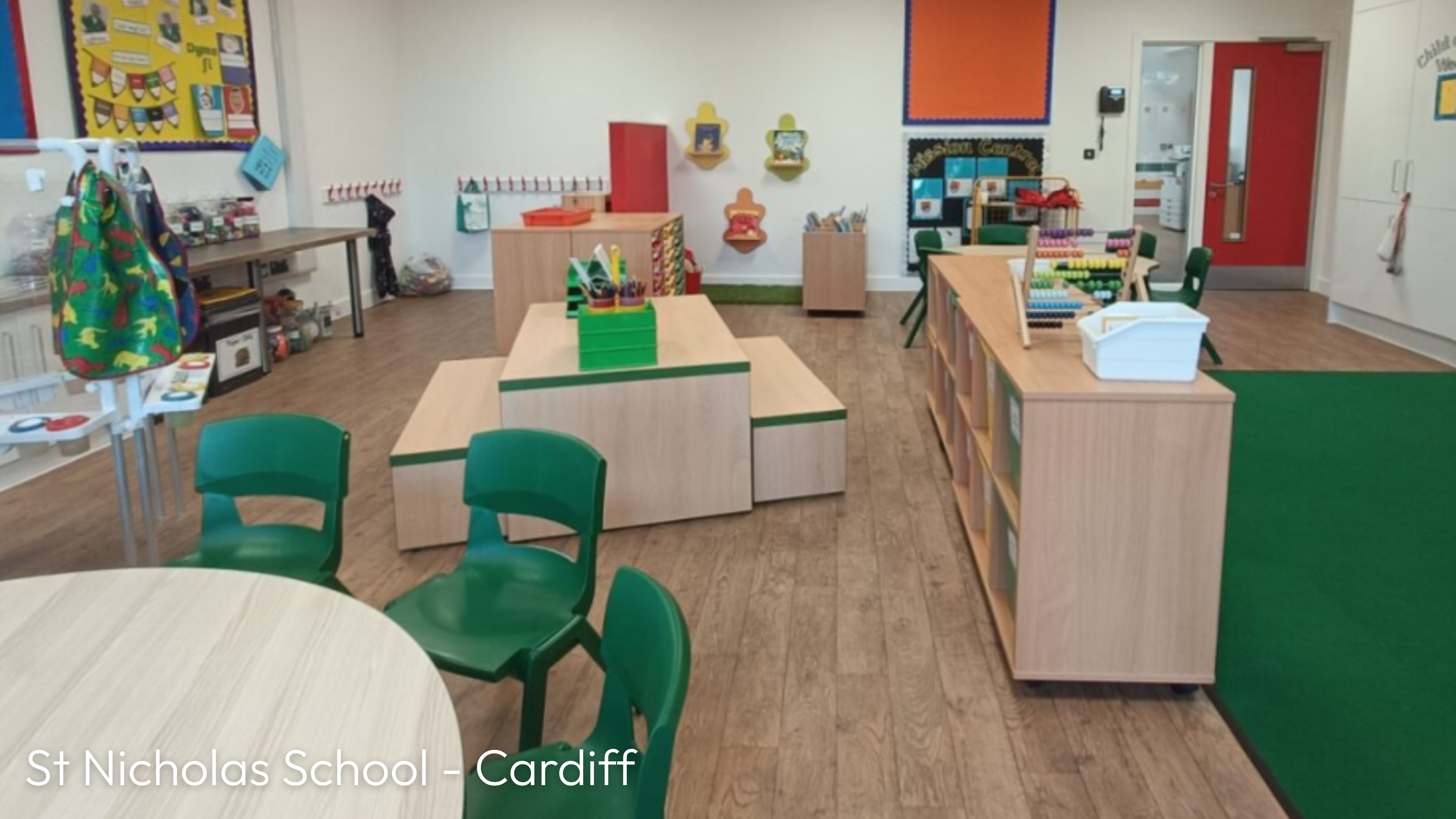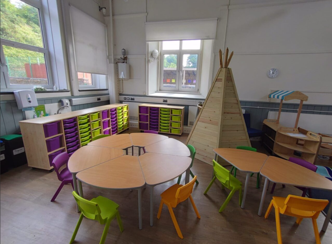 The nursery features multiple seating zones and purpose-designed furniture, all tailored to suit the scale, comfort, and needs of the pupils.